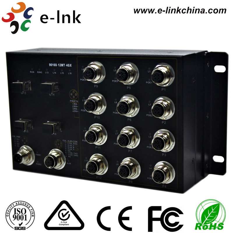 12x10/100Base-T M12ポート(12ポートはPOE+をサポート)+ 4x1000Base-X LCファイバーポート |